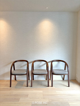 No.42チェアとHandyチェアの張地は、オー・ローズ ファニチャーの特注COM(カスタマー・オウン・マテリアル)のO-ROSEビニール(ガルグレー)で、daenチェアと一番奥にあるNo.42チェアの張地は宮崎椅子のEランクのHallingdal65-220(ベージュ/ホワイト)です。